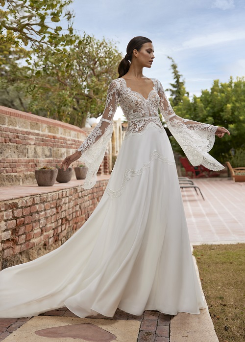 La robe Alexine de Hervé Paris est une création nuptiale qui incarne l’esprit bohème chic : fluide, féminine et délicate, parfaite pour une mariée qui souhaite une allure naturelle, romantique et légère le jour de son mariage.