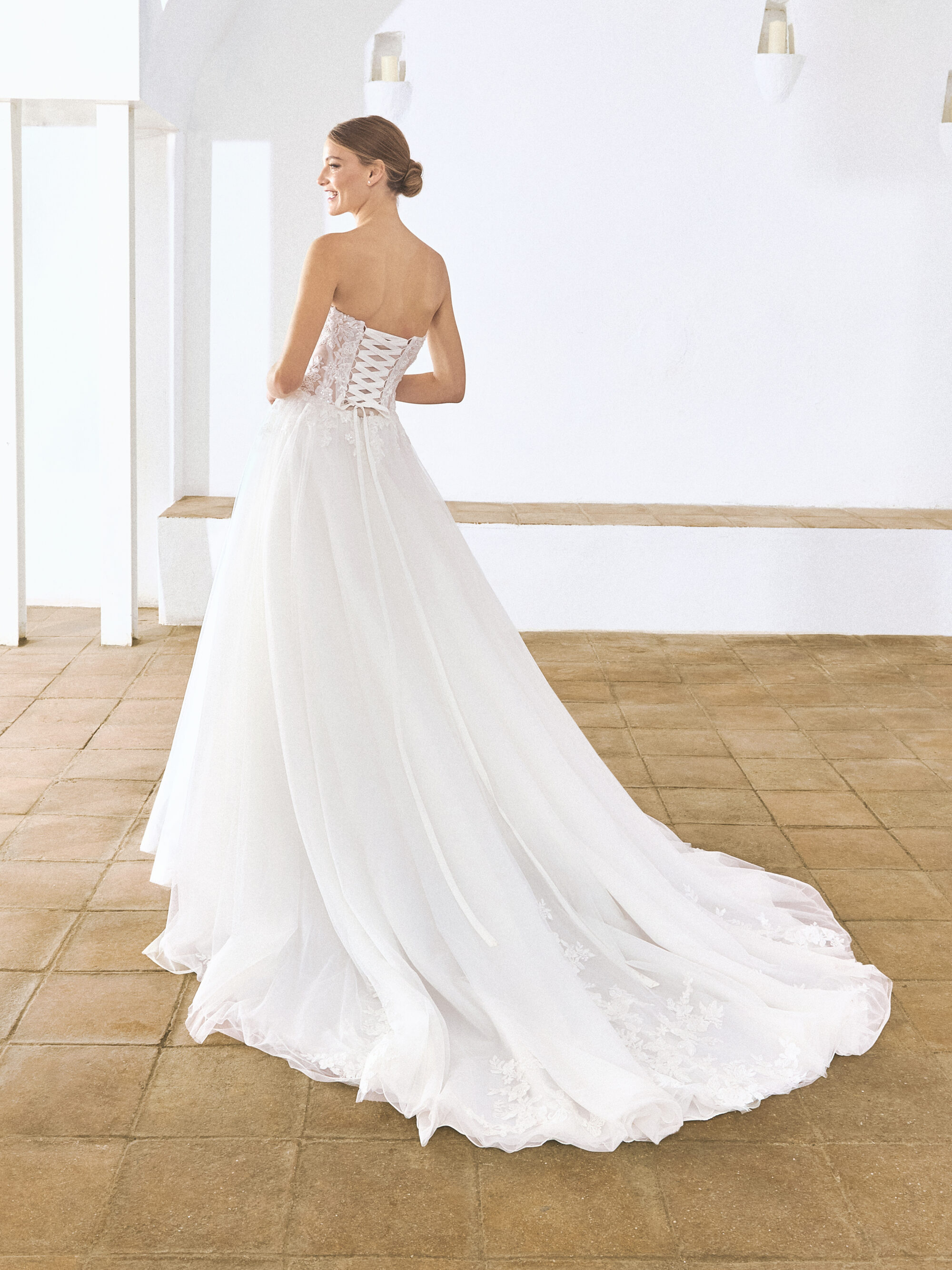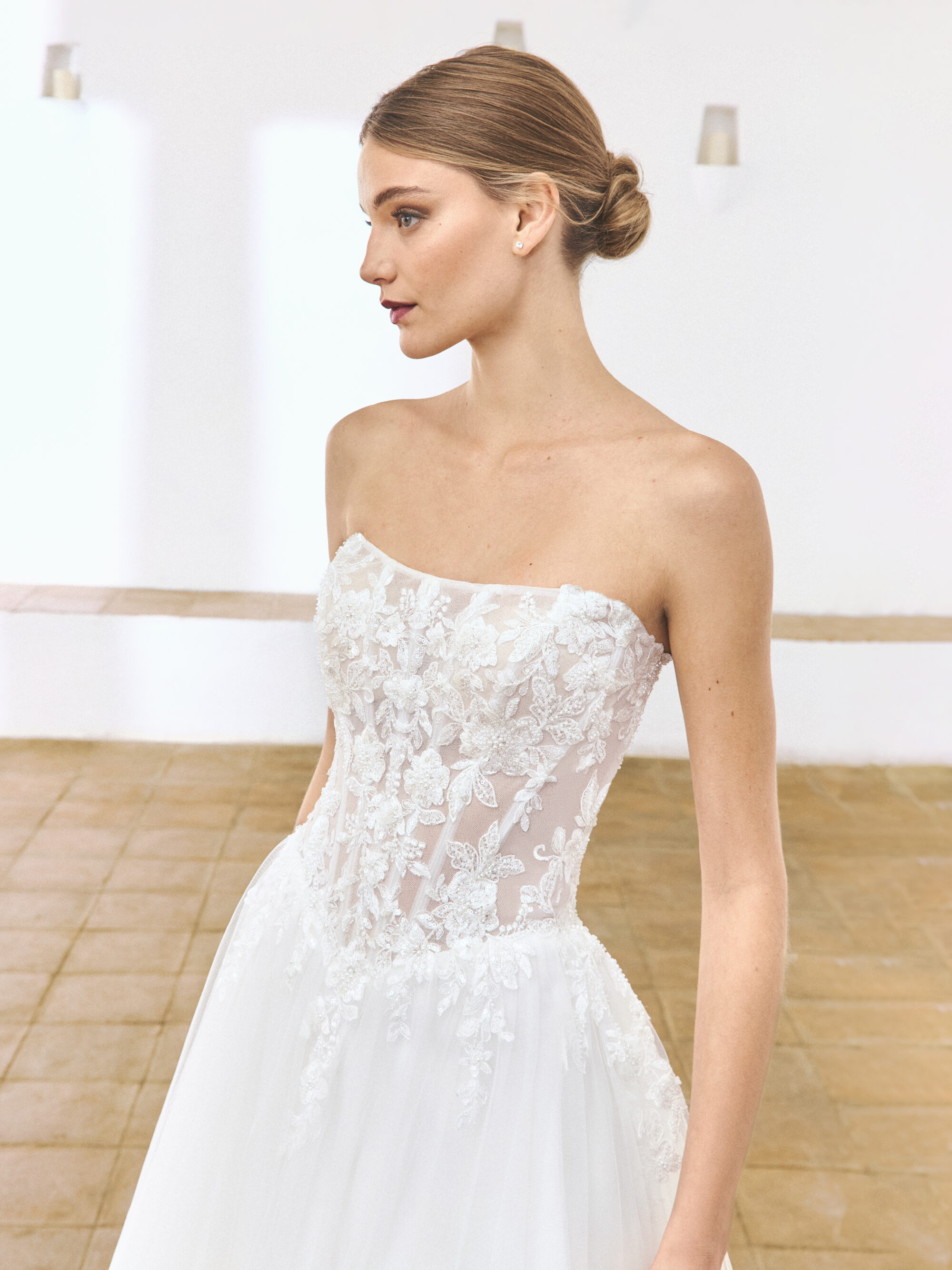 Cette robe princesse bustier est un pur enchantement. Des couches de tulle doux et de dentelle complexe créent une silhouette volumineuse, tandis que les perles ajoutent une subtile brillance à chaque pas.